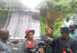 Mkuu wa wilaya ya Rungwe Mhe. Julius Chalya (kulia) akitoa maelezo ya chanzo cha maji (Intake) Masomo group kichopo katika mto Mbaka mbele ya Naibu Waziri wizara ya MAJI Mhe. Marypris...